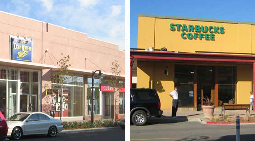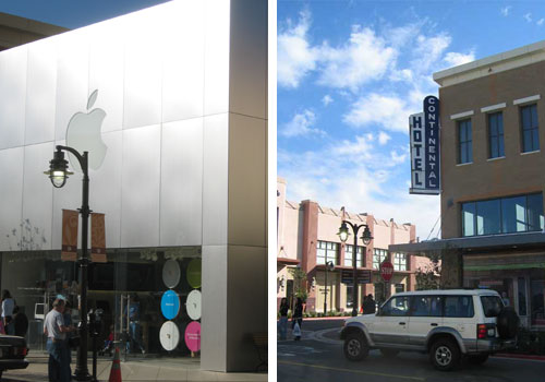 To create the convincing sense of a real town, the developers hired several architecture firms to design the various buildings in the complex. It is clear that the designers have studied not only Jerde and the New Urbanists, but that they have also carefully scrutinize real towns. None of the buildings are particularly interesting architecturally, the most impressive thing is that the buildings are scaled and proportioned well. Cleverly, it is not only the more quaint of building styles and eras that have been emulated; some of the buildings are actually bland stucco-boxes. This stroke of genius not only saved money, it is part of what lends a feeling of authenticity of a town that has grown over time with infill buildings. To further the less-than-perfect feel of a real town the streets vary in width and character, and service areas are within view. In general, the building styles progress from “older” in the center to “newer” towards the fringes, but there are exceptions.