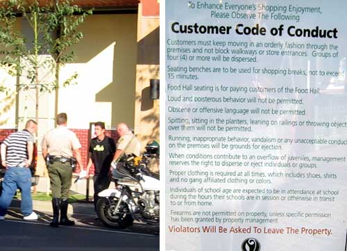 Another accidental occurrence which lent some realism to our visit was the sight of two men pulled over by the police and being frisked on a side street. Now that is a real city street scene for you. But just when it is starting to feel like a real town, you are reminded by the “customer code of conduct” signs that you are on private property after all. Don’t try to organize a protest rally at the “Town Square,” circulate a petition on the sidewalk, or roll out a picnic blanket on the grass. While the developers want Victoria Gardens to feel like small town America, what they really want is for you to open your wallet and shop.