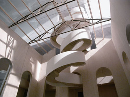 "Inside, the new AGO will house a dramatic corkscrew spiral walkway that wends its way through internal arches built in 1925. The walkway, which evokes Frank Lloyd Wright's Guggenheim in New York with its continuous helix that expands as it coils around a spatial well, twists up to the fourth floor of a light-flooded glass atrium. This architectural feature bridges traditional and modern, without compromising the integrity of the existing structure."