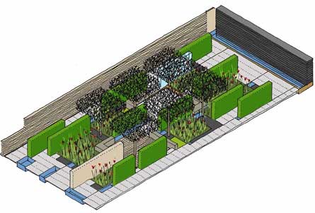 "This is a modern garden inspired by the tradition of enclosed gardens such as the early Islamic gardens. Historically the enclosed garden was a reaction to its setting. In contrast to the barren landscape by which it was surrounded it brought shade, water, planting and order."