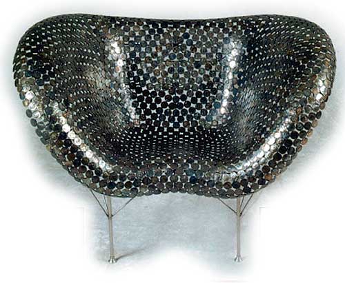 His nickel couch, made of over 6400 welded nickels, is a magnificient piece of work that is contoured for the body. His Jardelier, a chandelier made of glass jars, evokes a feeling of early 20th century invention with its illumination. These are but two example of an exceptional furniture line. The difference is in the art. Each is a unique example of beautiful and functional sculpture."