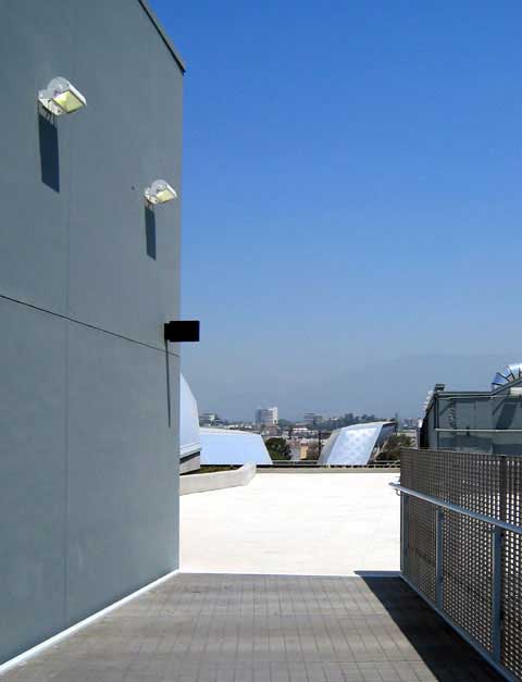 The building is known as the Wind Tunnel because it once housed the largest testing wind tunnel on the west coast. Los Angeles architects Daly Genik have done a marvelous job weaving together this hodgepodge complex of concrete buildings. The biggest design move is the placement of three large skylight structures on the roof which allow daylight to penetrate deep into the building. The skylights are "clad in layered lightweight high-tech plastic" and are a sculptural feature of the roof top garden.