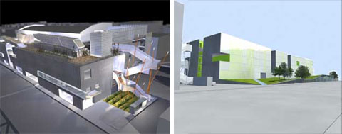 Rendering of the Wind Tunnel project (left) and a design proposal by Daly Genik for a student housing to be built to the south of the Wind Tunnel