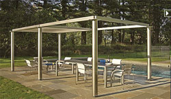 "Our new Pavilion is a modern garden gazebo designed to define space and create shade. The structure is 100% stainless steel with pleated vinyl mesh top and side curtains. Choose from our modular components to create your own layout."
