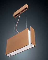 "In the Palio suspension lamp, bright halogen light is reflected from its glossy interior surface and is diffused by the bronze parallelepiped with gold reflections. Palio is suited for use as an individual lamp, but when in multiple compositions, it produces amazing effects. The shade is hung from a copper wire. Openings with staggered corners prevent glare."Designer: Ernst Strassacker