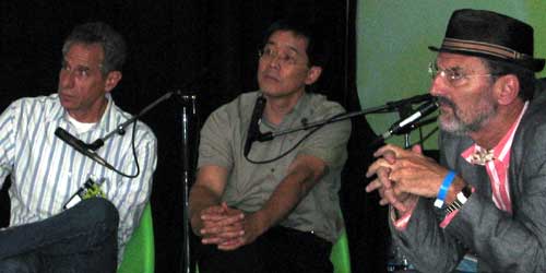 The "Fireside Chat" was scheduled to be with big gun architects Eric Owen Moss (director of SCI-Arc) and Thom Mayne, but the late running schedule would have bumped Futung Cheng, so the discussion became a threesome. The conversation meandered around politics, working at different scales and what it meant to each designer to express themselves through their work. To sum it up simplistically: Mayne spoke a lot about "exposing himself" through his work while Moss repeated that he wanted to work on "an enormous scale." Sounds kinda funny put like that. ;-)