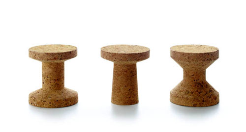 "The Cork Family of tables can double as stools. Light and velvety to the touch, each is shaped from a massive piece of pressed cork granulate."