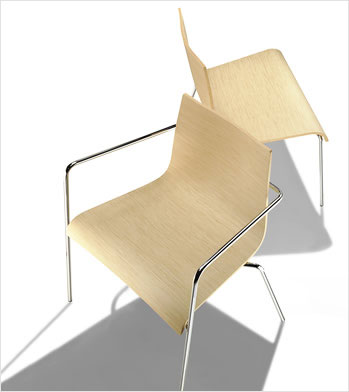 Lounge chair/armchair with tubular steel frame, chromed or silver painted. Shell in veneered plywood as per wood finishing sample book. Front shell upholstered and covered with fabric or leather as per sample book. Armrests can be covered with soft leather.
