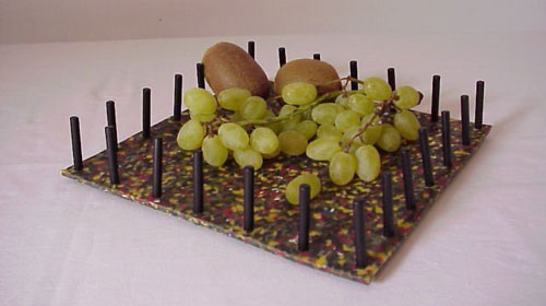 Since then we have launched products made crushed CDs, plastic water bottles, toothbrushes, banknotes, and Dapple, scrap from our own factory. In 2003 we introduced recycled Mobile Phones and Wellies."