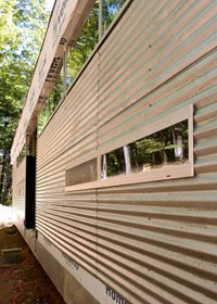 " This past weekend was a very productive one. On Thursday I took a load of construction debris to the dump and sprayed insulation around the windows. Barry installed OSB over one of the faux wall panels that houses a downspout and more siding was installed. We spent most of Friday afternoon assembling the aluminum frames for the 10' sliding doors, installing shims around each door frame and cleaning up around the site. On Saturday Barry and I installed all of the 10' sliding doors. Since the house is now "weathered in" we can have all of the electrical installed. Barry will also start staying in the house during the week instead of driving back and forth to Richmond each day."