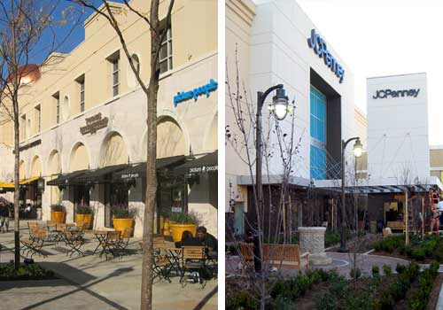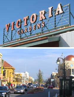 The name of this mall betrays its form; all of the shops are located along an urban grid of streets open to vehicular traffic, complete with parking meters and sidewalks. Parking lots and service areas located in the center of the blocks, much like a traditional American town. "Victoria Gardens" fails to provide a hint of the urban space that has been created, or perhaps this was an intentional move to calm local residents who may fear density.