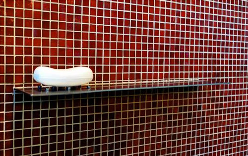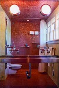 The entire bathroom is conceived as one continuous space, rather than little compartments. The floor surface is open and uninterrupted thanks to the wall mounted sink and toilet. Custom designed stainless steel fixtures include towel bars and shelves, and the large trough sink which is hung in front of the mirror wall and features two double-jointed kitchen faucets.