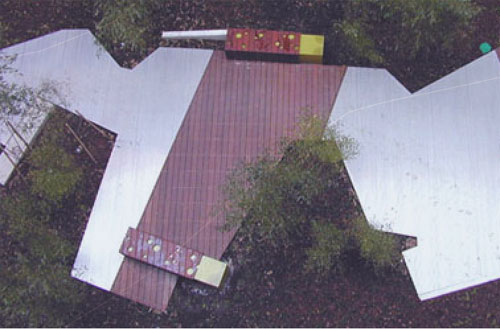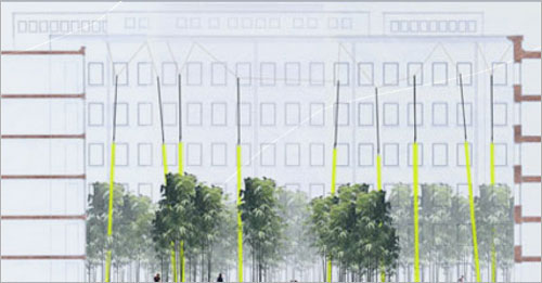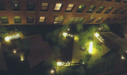 In contrast to the regularity of the existing structure, the landscape architects employed a concept of fragmentation; in the plantings, pathways, materials, topographic undulation, etc. Groovy lighting elements transform the space at night with a yellow green glow emanating from the benches and a fiber optic web amongst the bamboo. The design provides an stylish contemporary foil to the historic building.