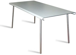 The form is elegantly simple, a table reduced to the minimum components. The top is made from compactforming HPL which can be made in any color. The tube steel legs can be removed by hand with no tools, and allow for two different table heights. The design also makes the table easily portable.