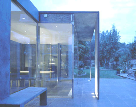 The existing kitchen was remodeled and expanded outward to include new dining and living areas within the bronze and glass Miesean pavilion. The concept is of a repeatedly folded plane of bronze which defines the space and frames views of the garden. Two of the glazed walls can be opened completely to create a seamless indoor/outdoor space.