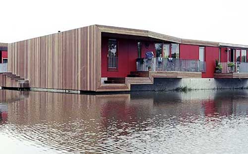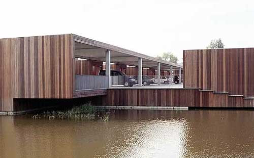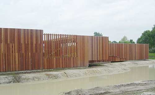 "Onix was requested by the Woonconcept Foundation to design approximately 14 patio bungalows for a small section of the Krakeel neighborhood in Hoogeveen. The houses are situated in a green zone that meanders through the suburb, consisting of an attractive green avenue, school facilities, ponds, a children’s farm, playing fields etc. An autonomous construction, the building forms a spatial jetty consists of private terraces, verandas, privacy screens, stages, a car port, end facades, roofs, a communal terrace, and an entrance gate to the inner area."