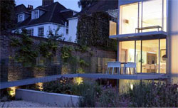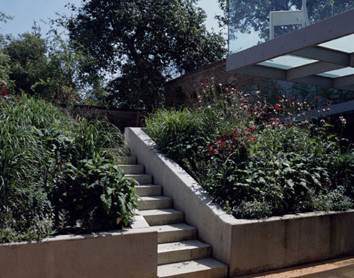 This modern garden serves as an extension of the remodeled and expanded home by Eldridge Smerin Architects, in the Hampstead Village Conservation area of London. Inspired by the materiality of Carlo Scarpa, Ms. Blom defined the landscape as an extension of the modernist addition with concrete, glass, limestone and steel. The rich colors of the planting contrast and soften the rigid forms and materials.