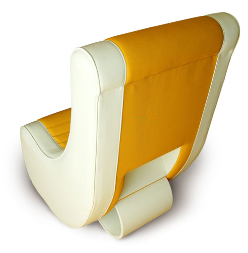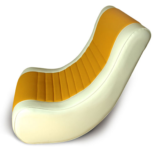 "The piece you're asking about is called 'SUGAR'. It's an adjustable lounger that's upholstered in vinyl over 3" foam. The yellow/orange band in the middle has a textured finish like scales on a fish, the white is a typical smooth texture. The pipe in the back acts as a support which fits into either of the 2 openings to create a laid back setting or more of an upright. I sometimes refer to it as a 'poor mans la-z-boy'. The pipe itself is pvc wrapped in vinyl as well. I also use it as a magazine holder."Along with the updated website, Adriean will be adding a few more pieces to I T E M's product lineup in the coming weeks so keep an eye out for them. We certainly will.