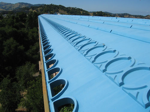 The roof structure is a pre-cast arched concrete shell with decorative circular design elements and half-circle openings along the eaves. The concrete is coated with a colored rubber coating. Wright's design called for the roof to be gold to compliment the dry grassy hillsides. But unlike the gold anodized aluminum detailing used for the fascia, railings and window mullions, the manufacturer of the roofing membrane could not guarantee the longevity of the gold color, so the decision was made after Wright's death to change the color to blue which Wright had intended for other details of the structure.
