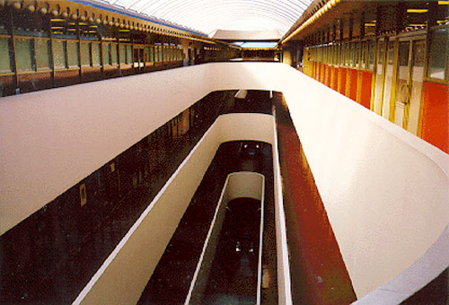 Reminiscent in a very basic way of a Roman aqueduct, Wright's concept was not, however, of load bearing arches but of a series of "suspended crescents... hanging from the floor above." Indeed with the exception of the lowest level of foundation arches, the arcs are an exterior skin hung on the building. The way the arches dissolve into thin metal strips emphasize this conceptual difference. According to Carl Book, Wright felt the original elevations were too evocative of an aqueduct and made the decision to change the top level arches to circular openings.