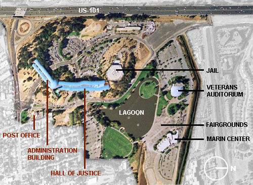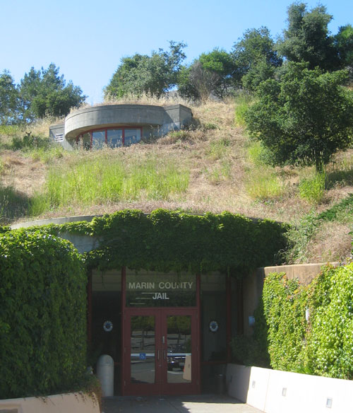 The Marin County Jail was designed by DMJM with planning input from Aaron Green and William Schwarz. The building, completed in 1994, is adjacent to the Hall of Justice but is mostly buried within the northernmost hill so as not to detract from the Wright designed building.