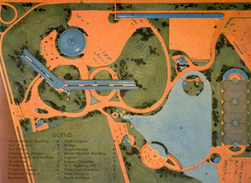 OVERVIEW OF SITE AS BUILT, WRIGHT DESIGNED STRUCTURES NOTED ON LEFT, STRUCTURES DESIGNED BY OTHERS ON RIGHT
