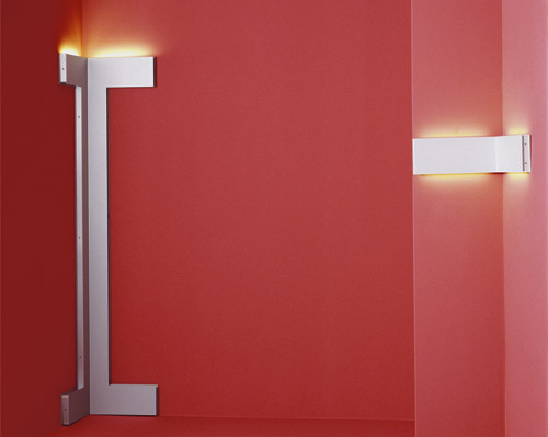 Elle: "A distinct sign, designed to be placed in the corners of a room, available in floor and wall versions. Elle is a strong presence, an unexpected light, an architectural project as well as an object of design. A different way to illuminate spaces."