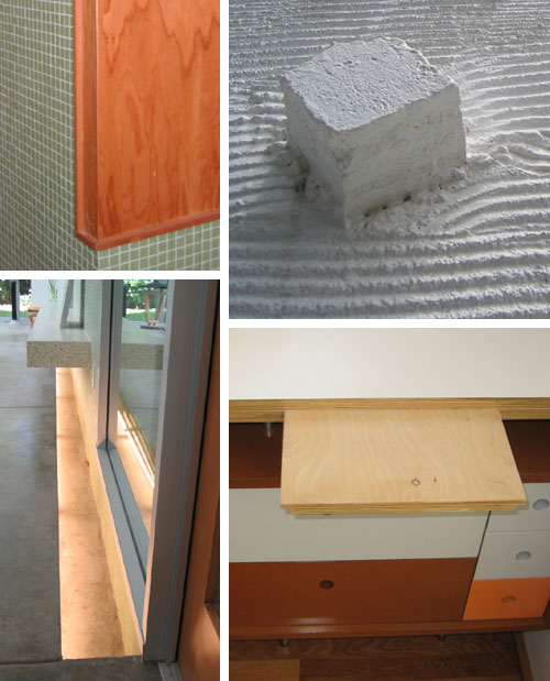 (CLOCKWISE STARTING AT TOP LEFT) DETAIL OF MARINE GRADE PLYWOOD AND MOSAIC TILE IN DOWNSTAIRS BATH; DETAIL OF EXTERIOR STUCCO FINISH; APPLEWOOD PLYWOOD DESKTOP WITH PULL-OUT TRAY AND STORAGE DRAWERS BELOW; LIGHT TROUGH RECESSED BELOW FLOOR ALONG WALL OF DINING AND LIVING ROOMS, CONTINUES UNDER TERAZZO HEARTH