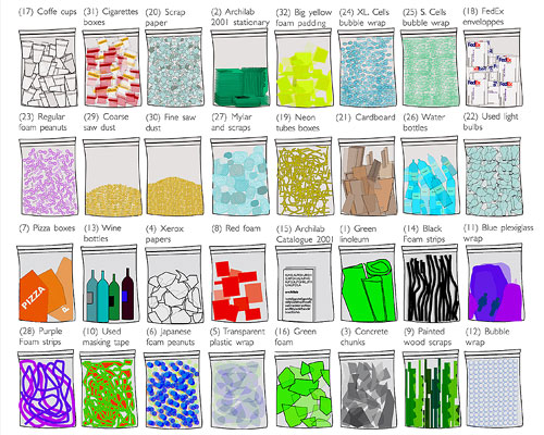"Leftovers" exhibition at Archilab in Orleans, France which collected and sorted the refuse associated with the creation of the exhibition.