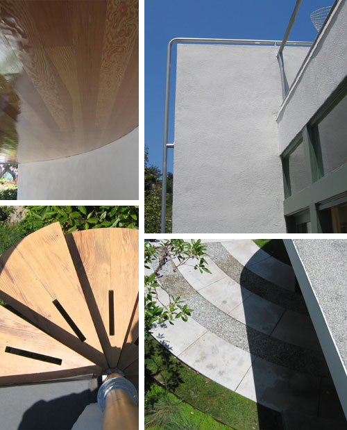 (CLOCKWISE STARTING AT TOP LEFT) WOOD CEILING OF CARPORT; DETAIL OF WALL AND RAILING FROM REAR DECK; LOOKING DOWN AT DRIVEWAY FROM ROOF TERRACE; DETAIL OF ROOF TERRACE STAIRWAY