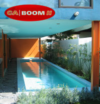 The east half of the ground level is occupied by sunken studio space that is the office of Glen Irani Architects. A series of steel wrapped desks are mounted on a track along the east wall of counter and storage space, allowing the desks to be pushed together or slid away to create a large open room. On the west side, a lap pool slides under the upper volume of the house, which is supported on orange steel columns. A lime green stairwell illuminated by skylights and small punched windows, features a switchback stairway suspended by thin steel rods. The stair is made of maple blocks inset with steel on the tread and riser surface.