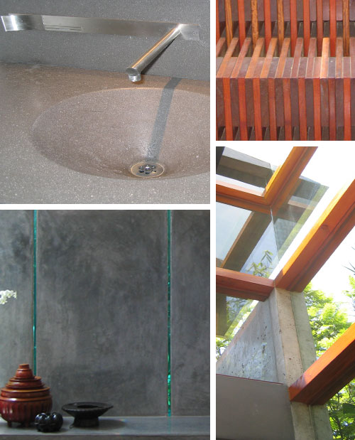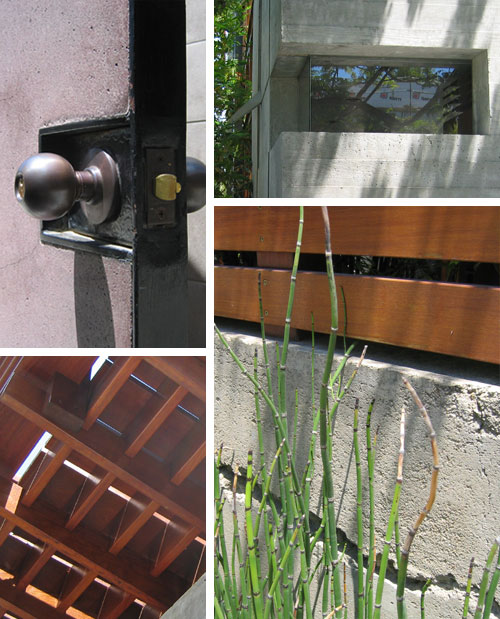 (CLOCKWISE STARTING AT TOP LEFT) CAST CONCRETE FRONT ENTRY GATE WITH STEEL FRAME; STEPPED BOARD-FORMED CONCRETE WALL WITH FRAMELESS CORNER WINDOW, ALSO NOTICE ANGLED METAL SCUPPER AT LEFT; RAMMED EARTH SITE WALL TOPPED WITH WOOD FENCE, EQUISETUM (HORSETAIL) GROWING IN FRONT; UNDERSIDE OF SECOND LEVEL DECK FRAMING.