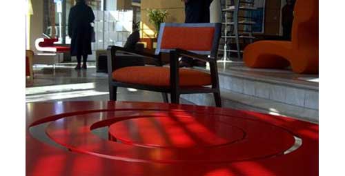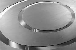 The Raindrops coffee table from cor3 creative works is a sleek table comprised of two rings and a solid center that can be exploded into three separate tables. The table is available in several finishes including steel and plexiglass (detail at right) and a dark wood. A red version is also featured from earlier product displays.