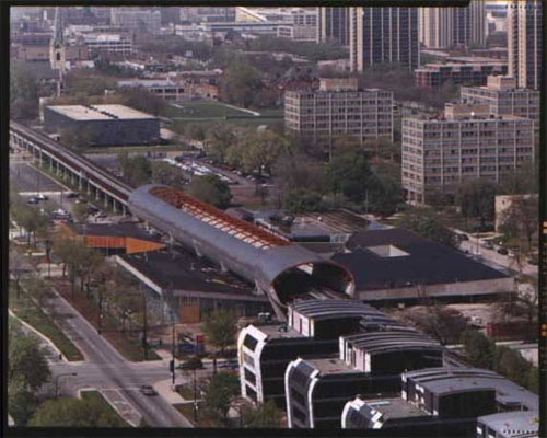 Overview of campus with Murphy/Jahn's State Street Village student residence complex (foreground), and Rem Koolhaas/OMA's McCormick Tribune Campus Center (center)