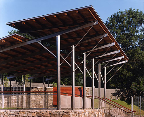 The juxtaposition of the wood elements with the stainless steel allows for a reading that is both modern and vernacular, both clean and textured. The pavilion's columns and beams rise from the earth with a natural economy of means, while its system of struts and cables suggest an architectural interpretation of the tendrils of climbing vines. The geometry of the column lines shift in plan and section, at once veiling the entrance to the pavilion, then opening the space dramatically out toward the gardens.