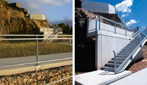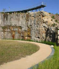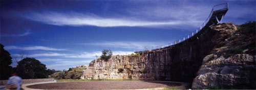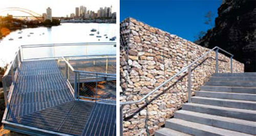 The former BP site was once the home of 31 massive oil storage tanks surrounded by thick concrete bund walls to prevent oil spills from entering the harbour. The new design uses a restrained composition of elegant, yet robust concrete and metal structures which wrap around the sandstone benches and cliffs projecting into the Sydney skyline. Ducks and other birds are returning to bathe in the constructed wetlands which capture water seeping from the old cliff faces. New trees and native plants are establishing on the exposed rock faces.