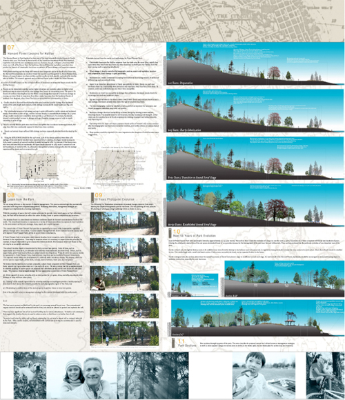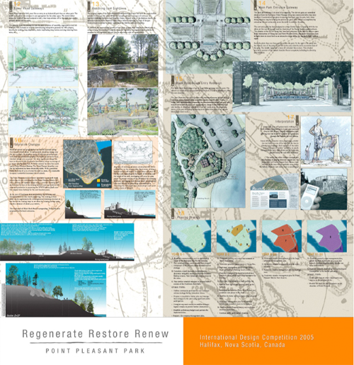 The competition to redesign Point Pleasant Park has been awarded to the firms NIP Paysage, Montreal and Ekistics Planning & Design, Dartmouth. Point Pleasant Park is a park in Halifax, Nova Scotia that has sustained damage in the way of insect infestation, ice storms and Hurricane Juan seriously damaging and degrading their coastal forest. Therefore, it is no surprise that the mandate for the competition was Regenerate, Restore and Renew focusing attention on strengthening coastal ecologies and preserving the unique heritage of the site. The panels themselves are lessons in ecology, detailing 50-year forest management and slope stabilization strategies, combined with native plantings and local materials.
