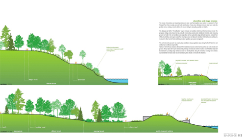 Ekistics has suggested using technology in the way of pod-casts as an alternative to traditional interpretive signage and is more sensitive to the aesthetics of the site, while N.I.P Paysage focuses on the immediacy of beginning the restoration process. Both teams take an integrative approach that will slowly transform and strengthen the condition of the site over time.