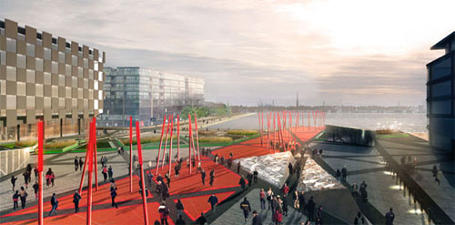 Her design features a striking composition of a red "carpet" extending from the theatre into and over the dock crossed by a lush green "carpet" of paving with lawns and vegetation. The red “carpet” will be made of bright red resin-glass paving covered with red glowing angled light sticks. The green "carpet" of polygon-shaped planters will offer ample seating and will connect the new hotel to the office development across the square. The planters will feature marsh vegetation to soften the space and to act as a reminder of the historic wetland nature of the site. These will bring colour and variety to the space and act as a setting for the new buildings.Link: Dublin Docklands Development Authority