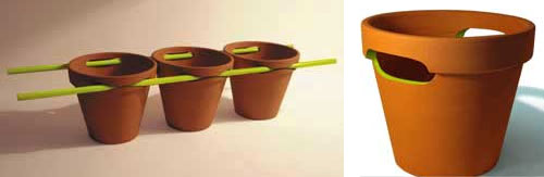 The pots are grouped via steel bars which slot into slices on each side. The steel bar and wire suspension system allows eight or twelve pots create a vegetable wall. Might create a mess when you water... but whatever. Single pots are also available in a non-hanging version.