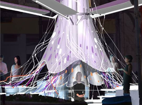 Nothing to do with the UK national treasure... the London Oasis is a temporary structure on Clerkenwell Green installed as part of national Architecture Week. It is a kinetic sculpture by architect Laurie Chetwood designed to demonstrate sustainability and renewable energy while providing entertainment, a place for meeting and tranquil space for Londoners. Self-sufficiently powered by solar cells, a hydrogen fuel cell and wind, the Oasis interacts with the environment around it. Shade providing "branches" open and close in response to the weather. Enclosed pods at the base provide a place of seclusion for people to rest with "cleaner cooled air and relaxing sounds." At night the Oasis acts as a beacon in the cityscape with lights which repsond to the movements of people around it. It even uses rainwater it has collected for irrigation and cooling.
