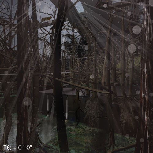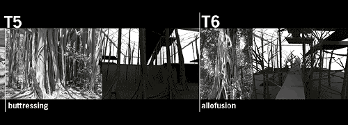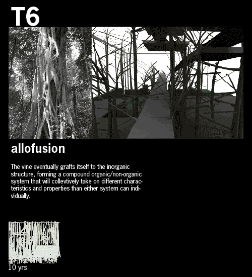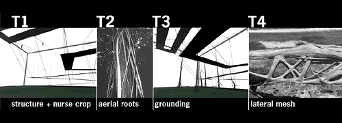 The proposal by David Fletcher + Juan Azulay proposes a light weight structural system enveloping the site to provide support for the growth of an organic sturctural system - strangler fig (f. petiolaris). Over time, the organic structure fuses with the non organic structure and becomes dominant.