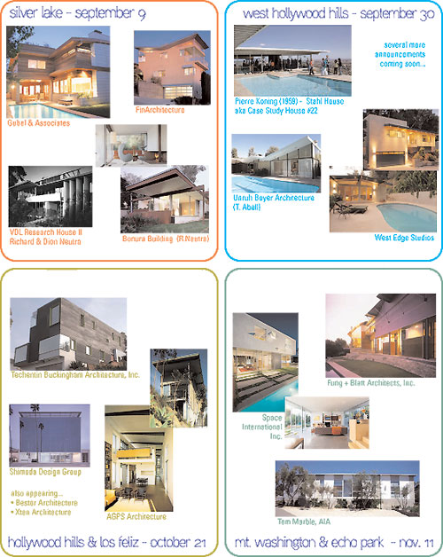 Each day the Fall Tour Series will visit five to six recently completed ground up projects and several renovations of 60's hillside view homes. Selected tours will also feature stops to modernist masterpieces such as Pierre Koenig's Case Study House #22 and Richard and Dion Neutra's VDL Research House II.