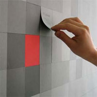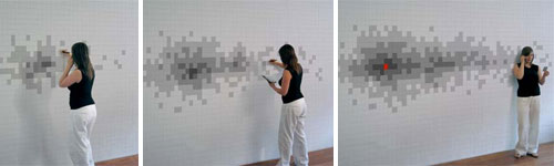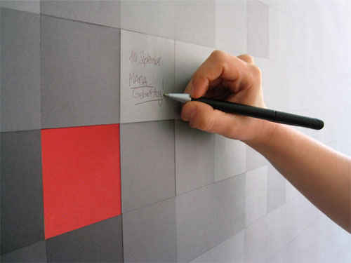 A functional wallpaper designed by Duncan Wilson in collaboration with Sirkka Hammer Sirkka Hammer... and Duncan Wilson? Now we're not sure... anyway. the once collaborative team of Duncan Wilson and Sirkka Hammer, Pixelnotes is comprised of a grid of post-it-note-like sheets with four layers of graduated grey tones mounted over a bright primary backing. The result is a constantly changing grided matrix as notes are written and removed revealing different layers. "Pixelated formations and shapes develop according to our patterns of use."