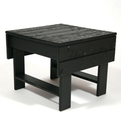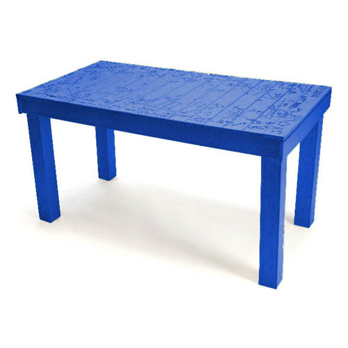 The "I was here" collection designed by Jason Miller will take you back to that one summer at (band?) camp when you carved your name into the camp picnic tables. The collection features various tables and a bench constructed from "graffiti-proof" plastic wood with all sorts of random New York graffiti carved into the top of them. Available colors include white, black, brown, and blue.