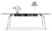 A table that features two circular sockets in the center that can accept any number of modular plug-in pieces including electrical outlets, light fixtures, and various containers.