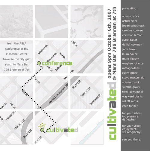 The ASLA meeting in San Francisco is coming up quick, which means it is almost time for Cultivated, the event where landscape meets art... and Landscape Architects meet artists on October 6th at 9:00 pm at the Mars Bar.