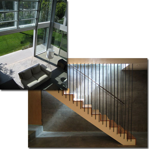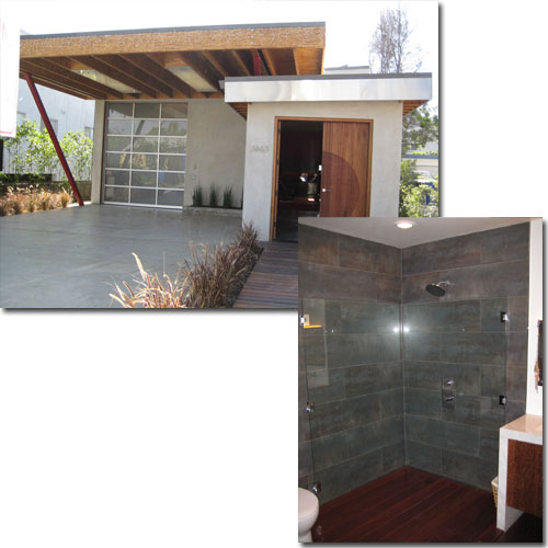 This project was also quite unusual in almost every aspect, and some people would deem it as "interesting." This structure is another example of good individual ideas that failed to make a coherent whole, probably also due to lack of a "lead professional." Most contractors would probably beat the previous statement out of me, but if just shows when someone puts together a space and living idea based on an untrained background. There can be strokes of genius in cases like this, and Delta H Design managed to pull one off via the master bathroom and the finishes and configuration used in this situation. The entire floor space is one big floating wood deck, which goes very nicely with the patina tile on the walls. Then one of the owners folds out two long glass doors, which had been resting flush against the wall, and the gigantic shower magically appears and disappears just like that. The drain and shower pan is concealed under the deck... Magic!