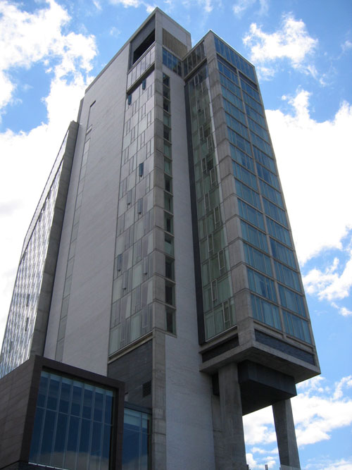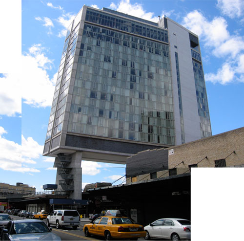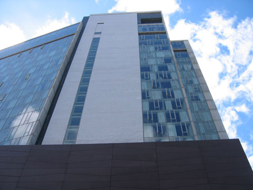 OK, a few words to orient: The Standard New York is the fourth hotel in the boutique chain from Andre Balazs (I'm partial to the one in downtown Los Angeles... I like the pseudo-corporate overtones of the former oil company headquarters... but anyway). The NYC incarnation is located in Gansevoort Market--more commonly called The Meatpacking District. It is the first ground-up structure built as a Standard Hotel and is the creation of New York firm Polshek Partnership Architects.