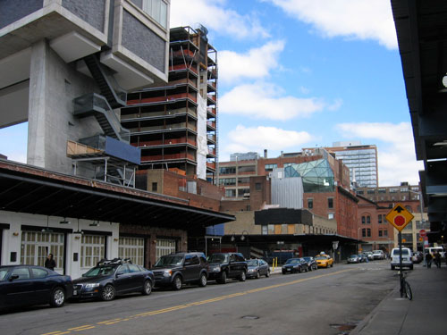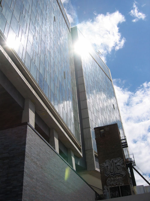 Other aspects of the project are not as convincing. While the monumental gestures and distant vistas are impressive, some of the more intimate pedestrian experiences reveal the design's weakness. The opportunity to explore the contrasting relationship of the modern vocabulary of the tower as it meets the ground plane and wraps beneath the High Line at the lobby is largely squandered. There are a few nice moves to highlight the contrast between old and new, but the architecture of the lobby feels divorced from the tower. But my disappointment with the design comes mainly from choice to insert an uncomfortably faux-historic brick structure partially beneath the High Line to the south of the main entry. It is meant to look like an adaptive reuse of an existing structure; like an organic piece of the urban fabric absorbed into the project. But it isn't. Rather it is a lazy element of the design meant to "blend" with the surrounding streetscape and heighten the effect of the modern tower hovering above. I get it... but I think it is a missed opportunity. And just to bitch some more, the inset veneer of brick on the lower section of the tower seems a bit gratuitous...